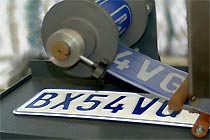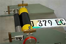 The embossed number plate is drawn automatically through the system at the right speed. The painter roller system operates with electricity or battery. |